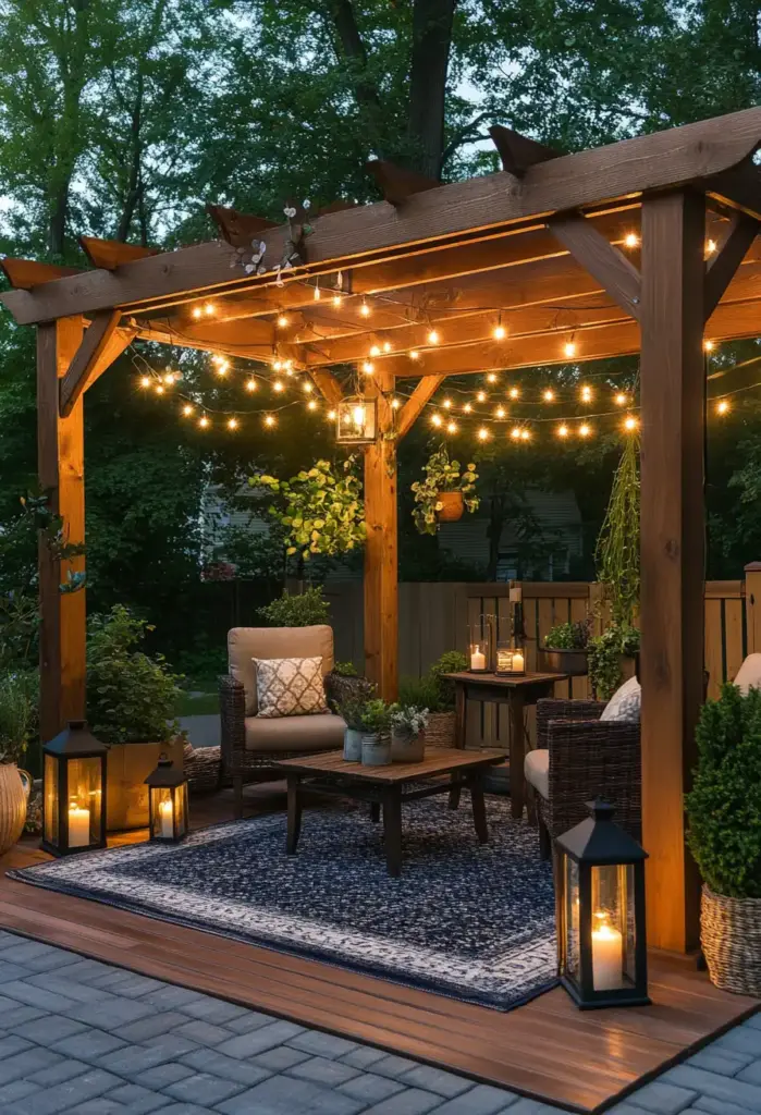 Turn your outdoor space into a celestial escape with starry night pergola patio ideas that are perfect for dreamers and stargazers. Start with a pergola equipped with a retractable canopy—ideal for switching between shade by day and open skies by night. Install dimmable LED lights or soft string lights across the beams to mimic a twinkling night sky.